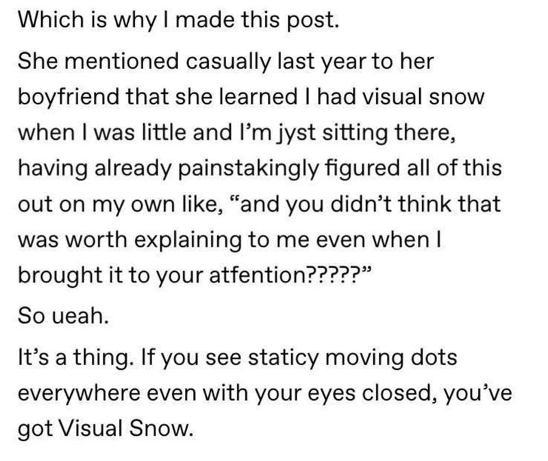 Visual snow may also be referred to as visual static or positive persistent visual disturbance. the clinical term for it is aeropsia, which literally translates to seeing air. the condition is often described as seeing tiny white and black dots that resemble the poor reception a tv can receive, but in a very.